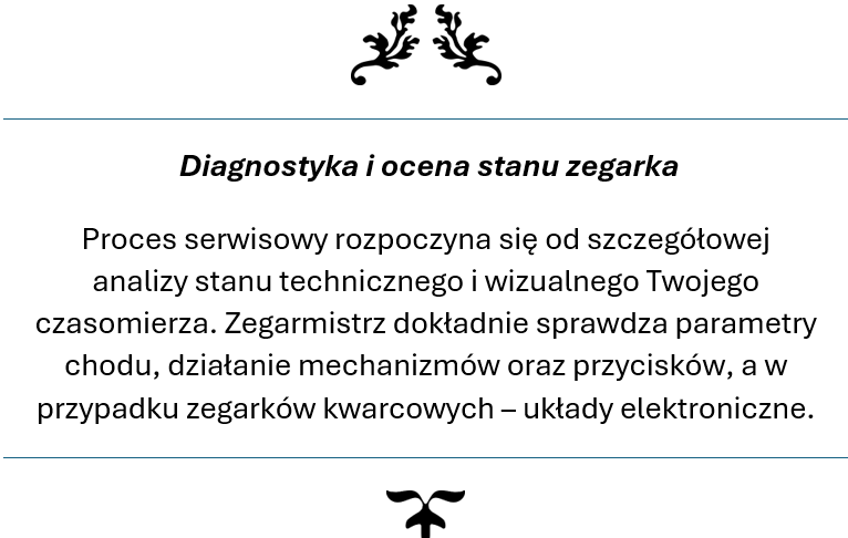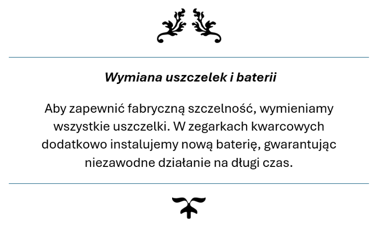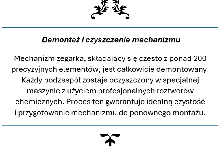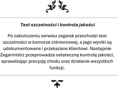 Twój zegarek trafia w ręce ekspertów, którzy rozumieją jego wartość – zarówno materialną i emocjonalną. Przywracamy mu perfekcyjne działanie, pierwotny blask oraz niezawodność, jakiej oczekujesz od prestiżowego czasomierza. Z nami masz pewność, że Twój zegarek jest traktowany z najwyższą starannością i szacunkiem, na jaki zasługuje.